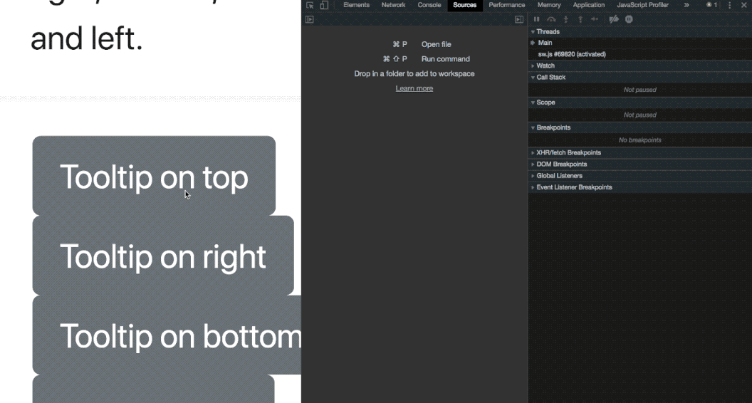 我们很难去检查一个只有在 Hover 状态下展示的元素。比如,如何去检查一个 tooltip?如果你右键并选择检查,元素已经消失了。那么有办法吗? (1)打开 sources 面板 (2)显示 tooltip (3)使用快捷键来暂停脚本执行(将鼠标停留在暂停的图标上查看快捷键) (4)回到 Elements 面板,然后像通常一样去检查元素